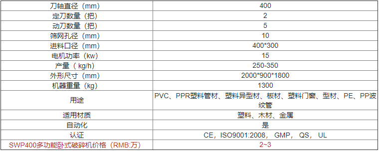 | SWP400多功能臥式破碎機(jī)價(jià)格(RMB:萬) | 歡迎來電咨詢 |