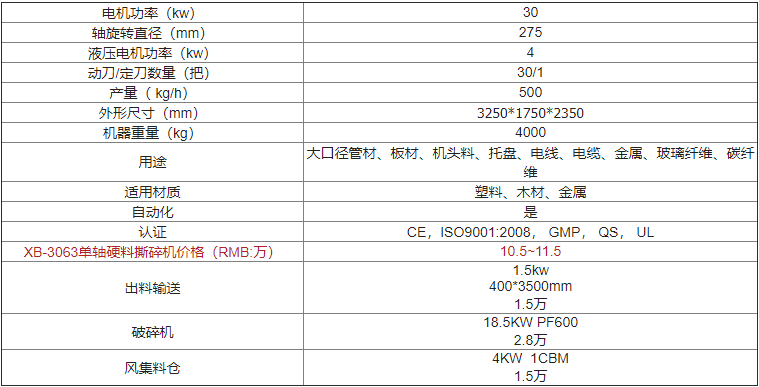 | XB-3063單軸硬料撕碎機價格(RMB:萬) | 歡迎來電咨詢 |
