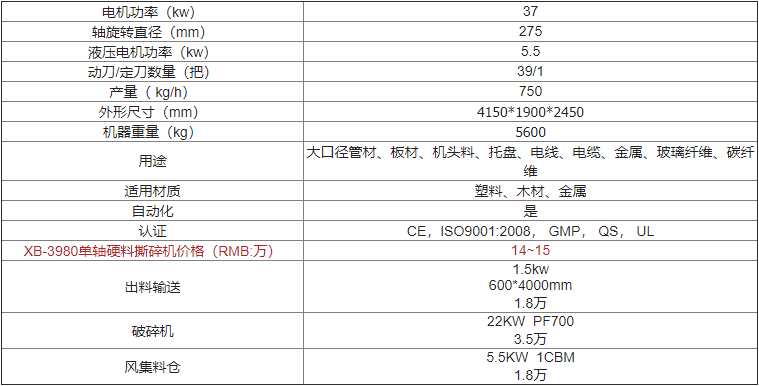 | XB-3980單軸硬料撕碎機(jī)價(jià)格(RMB:萬(wàn)) | 歡迎來(lái)電咨詢 |