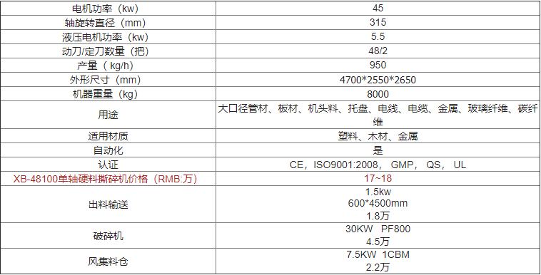 | XB-48100單軸硬料撕碎機價格(RMB:萬) | 歡迎來電咨詢 |