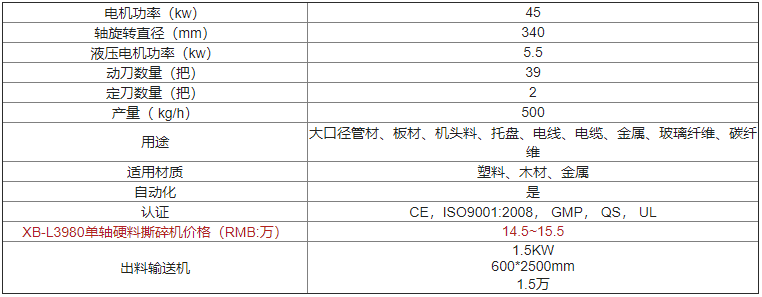 | XB-L3980單軸軟料撕碎機(jī)價(jià)格(RMB:萬(wàn)) | 歡迎來(lái)電咨詢 |