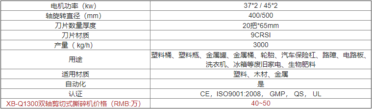 | XB-Q1300雙軸剪切式撕碎機(jī)價(jià)格(RMB:萬(wàn)) | 歡迎來(lái)電咨詢(xún) |