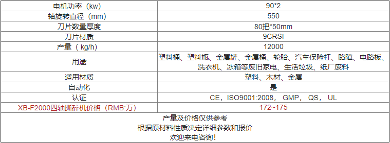 | XB-F2000四軸撕碎機(jī)價(jià)格(RMB:萬(wàn)) | 歡迎來(lái)電咨詢 |