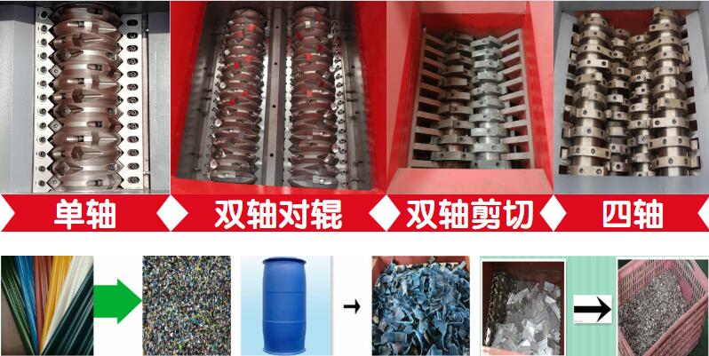 1、從軸的數(shù)量上分類大致可以分為:單軸撕碎機(jī)(1根軸)、雙軸撕碎機(jī)(2根軸)、四軸撕碎機(jī)(4根軸)。